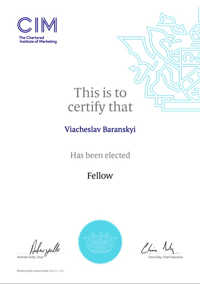 I’m a Fellow of the Chartered Institute of Marketing (FCIM), which is the highest membership grade CIM offers. Less than 1% of marketers globally hold it. I’m not saying this to flex — I’m saying it because it took 15 years of CMO work and a lot of honest mistakes to get there.