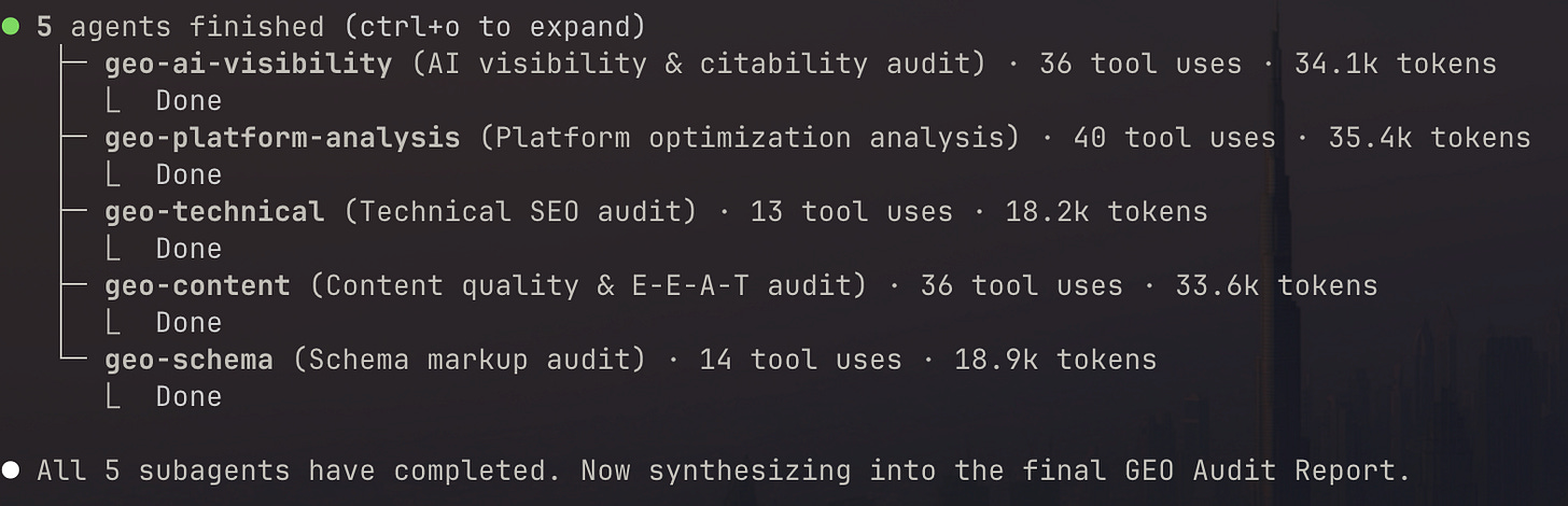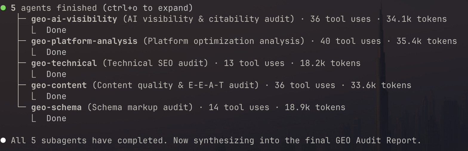 When you run /geo audit <url>, the tool doesn’t work sequentially. It spawns five parallel subagents, each with a different specialty: