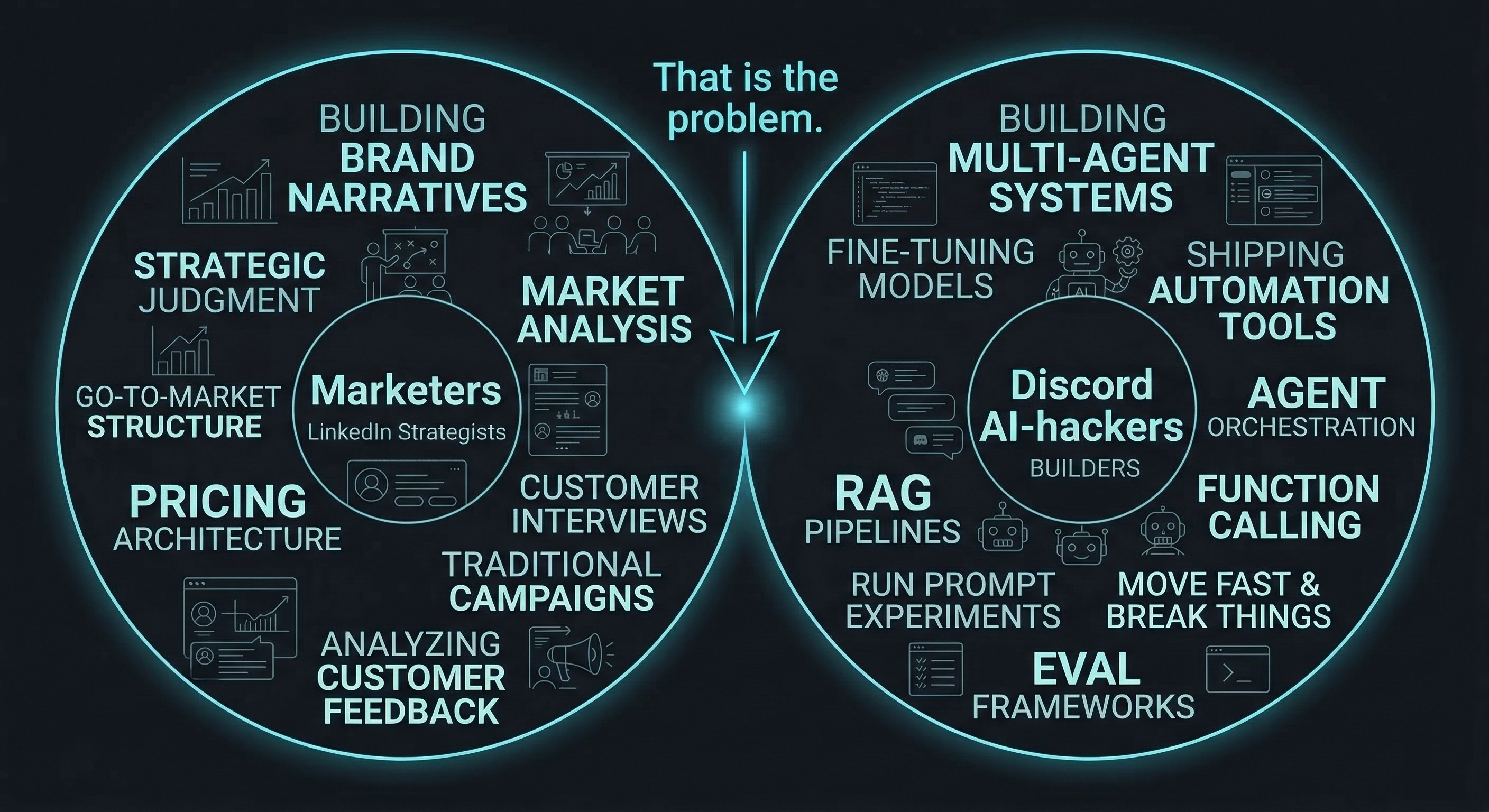 Part of it is identity. “Marketer” and “builder” feel like different job descriptions, different kinds of people. The assumption is that strategy and execution are separate disciplines requiring separate humans.