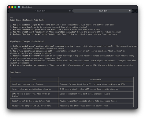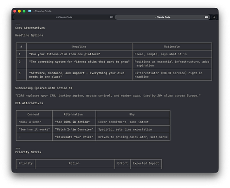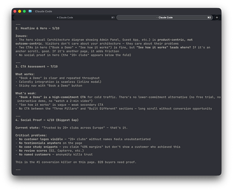 Twenty minutes later I have a structured report with specific recommendations, copy alternatives, and a list of things to A/B test. Not because the AI is brilliant. Because it has a skill installed that knows how CRO works, and it applied that skill to my specific situation.