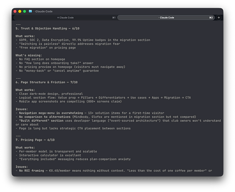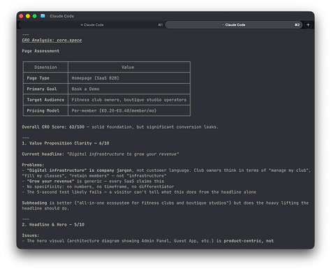 I’m working on a landing page for a new product. Instead of staring at a blank doc, I tell my Claude agent: run a CRO analysis on this page. The agent doesn’t ask me what CRO means. It doesn’t give me a generic list of “best practices.” It pulls a conversion rate optimization framework, checks my product context that it already knows from previous sessions, and walks through the page section by section. Value proposition clarity. Headline structure. CTA placement. Trust signals. Friction points. Objection handling.