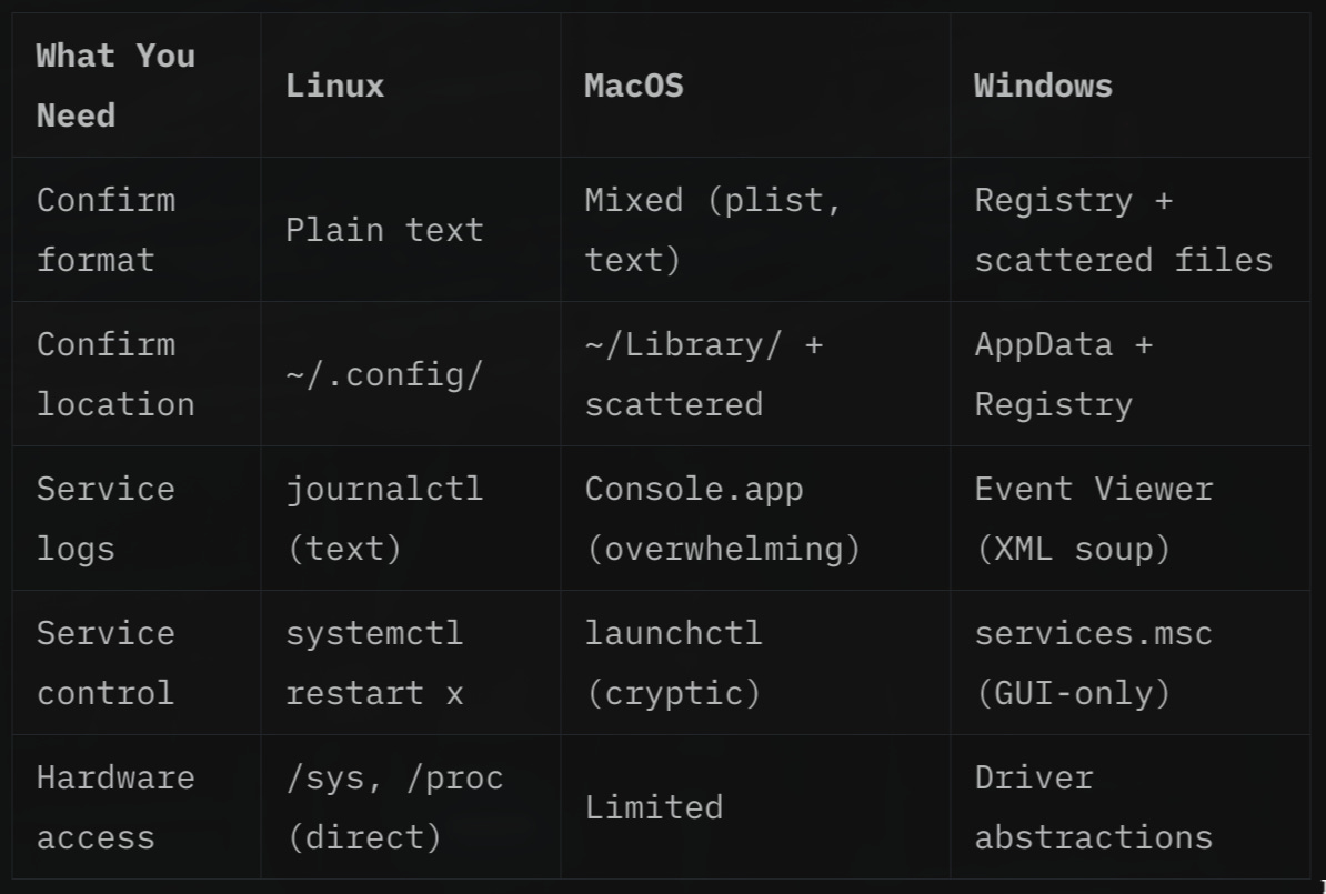 On Windows or MacOS, the same request hits a wall. Binary formats. GUI-only settings. Undocumented registry keys. APIs that require specific tools.