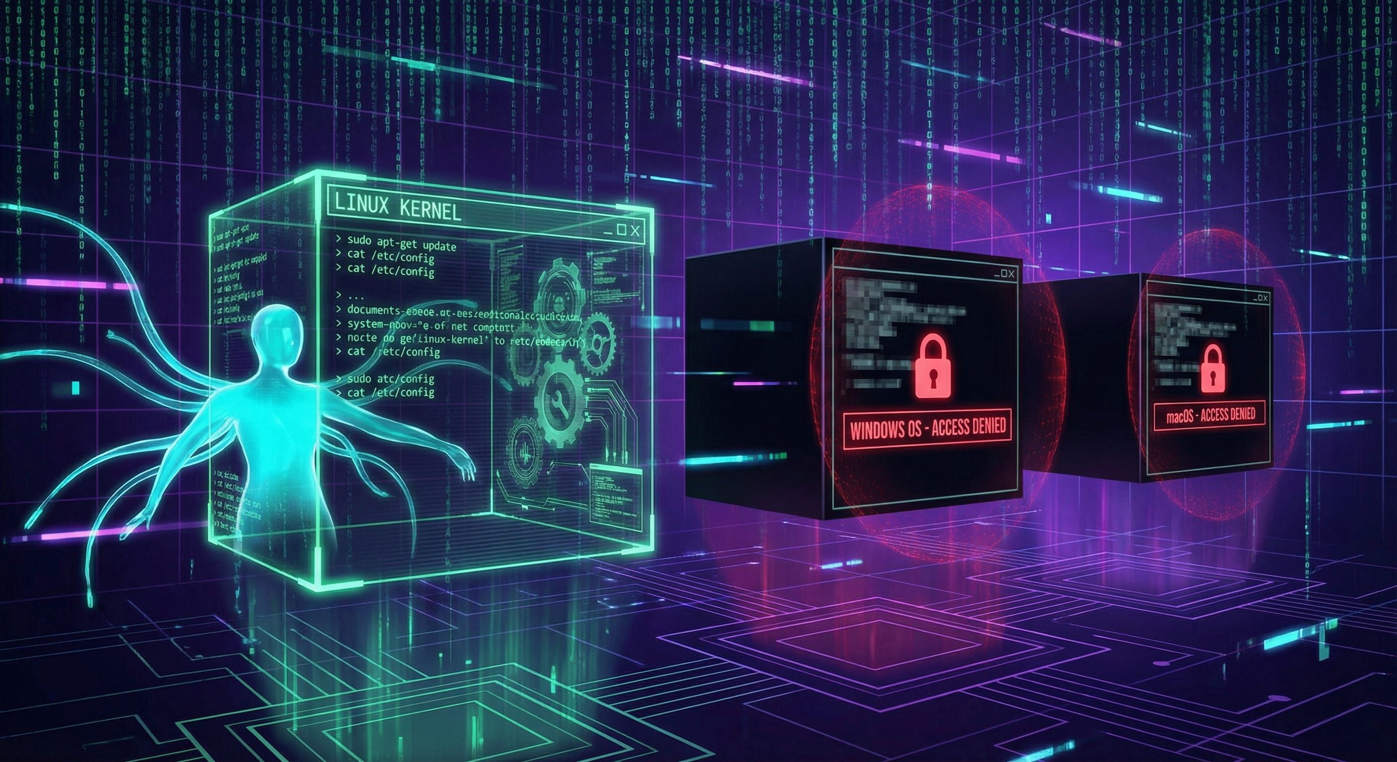 Windows hide everything behind abstractions. MacOS locks you out of your own system. Linux shows you the gears.