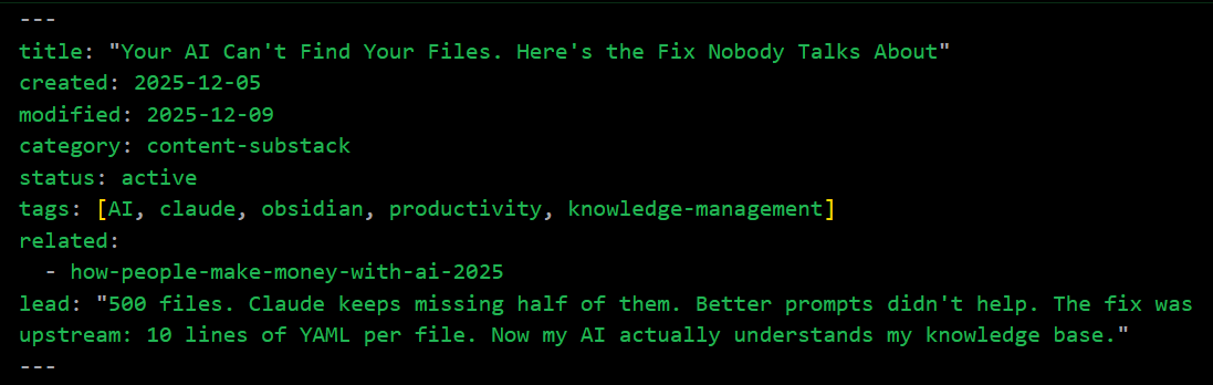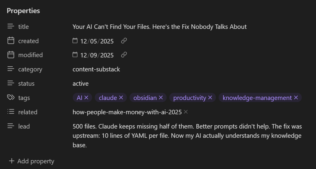 500 files. Claude keeps missing half of them. Better prompts didn't help. The fix was upstream: 10 lines of YAML per file. Now my AI actually understands my knowledge base.