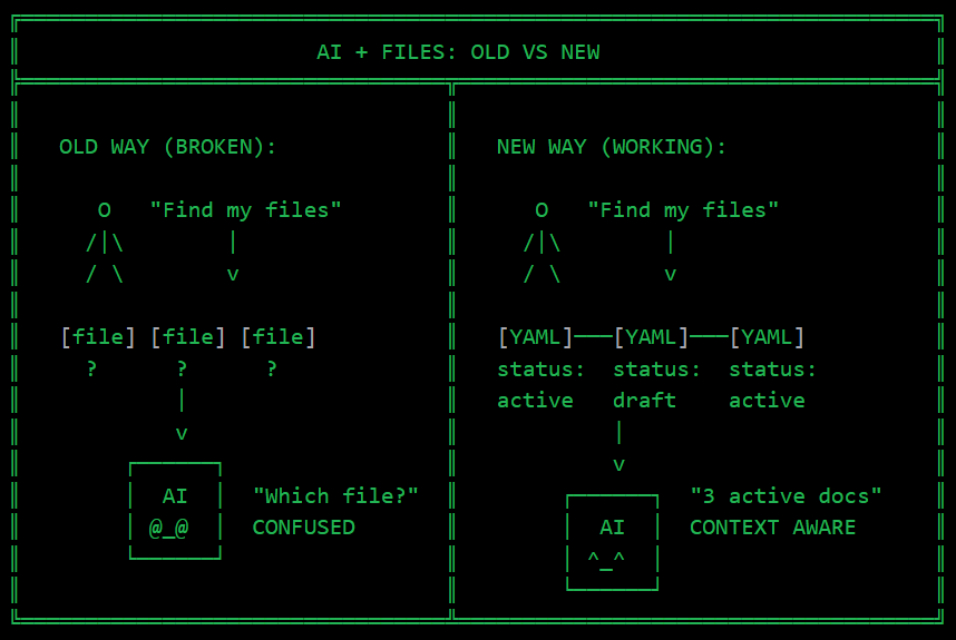 Your files already contain relationships, statuses, and timelines. YAML frontmatter just makes them explicit. Machine-readable. Actionable.