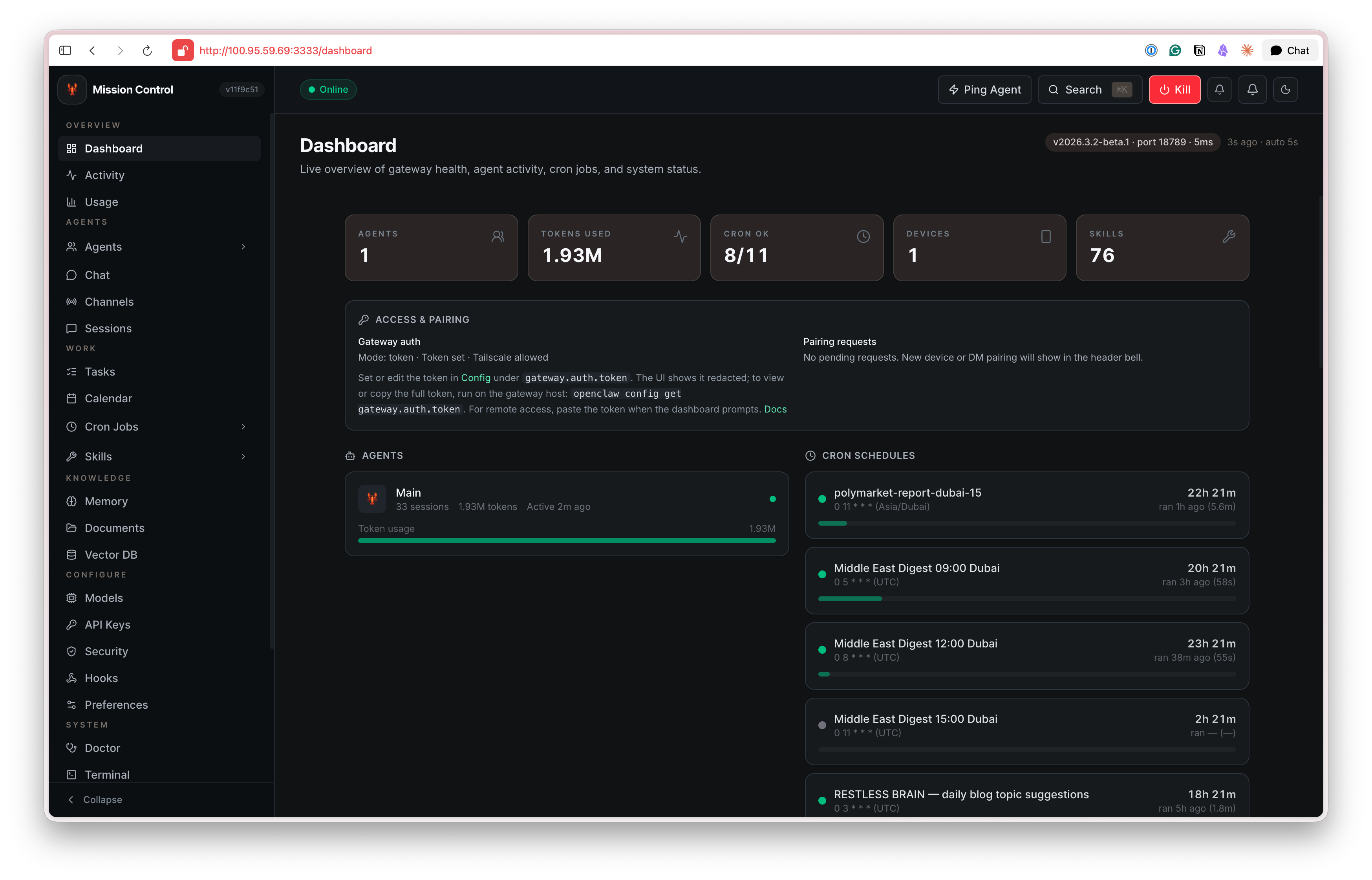 The server runs cron jobs on a schedule. At 7am Dubai time every morning, one of them pulls my calendar, emails, and recent work logs, then posts a briefing to my Telegram. Another one — the one that triggered this post — reviews yesterday’s activity and suggests five content ideas at the same time. There’s also a mission control channel where I can see the state of everything: which jobs ran, what they produced, where something failed. It’s not a polished dashboard, but it tells me what I need to know.
