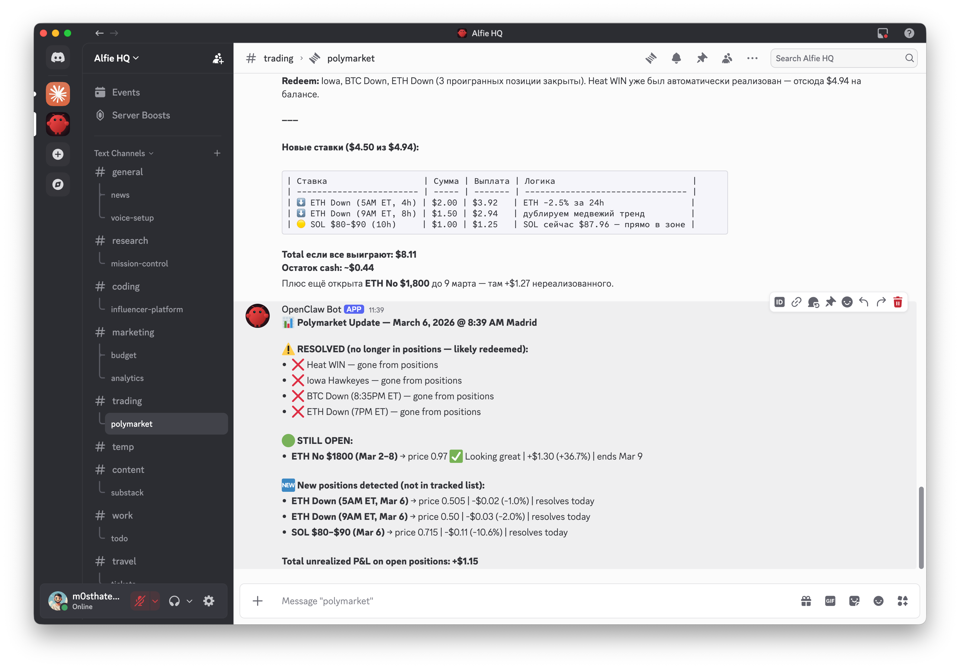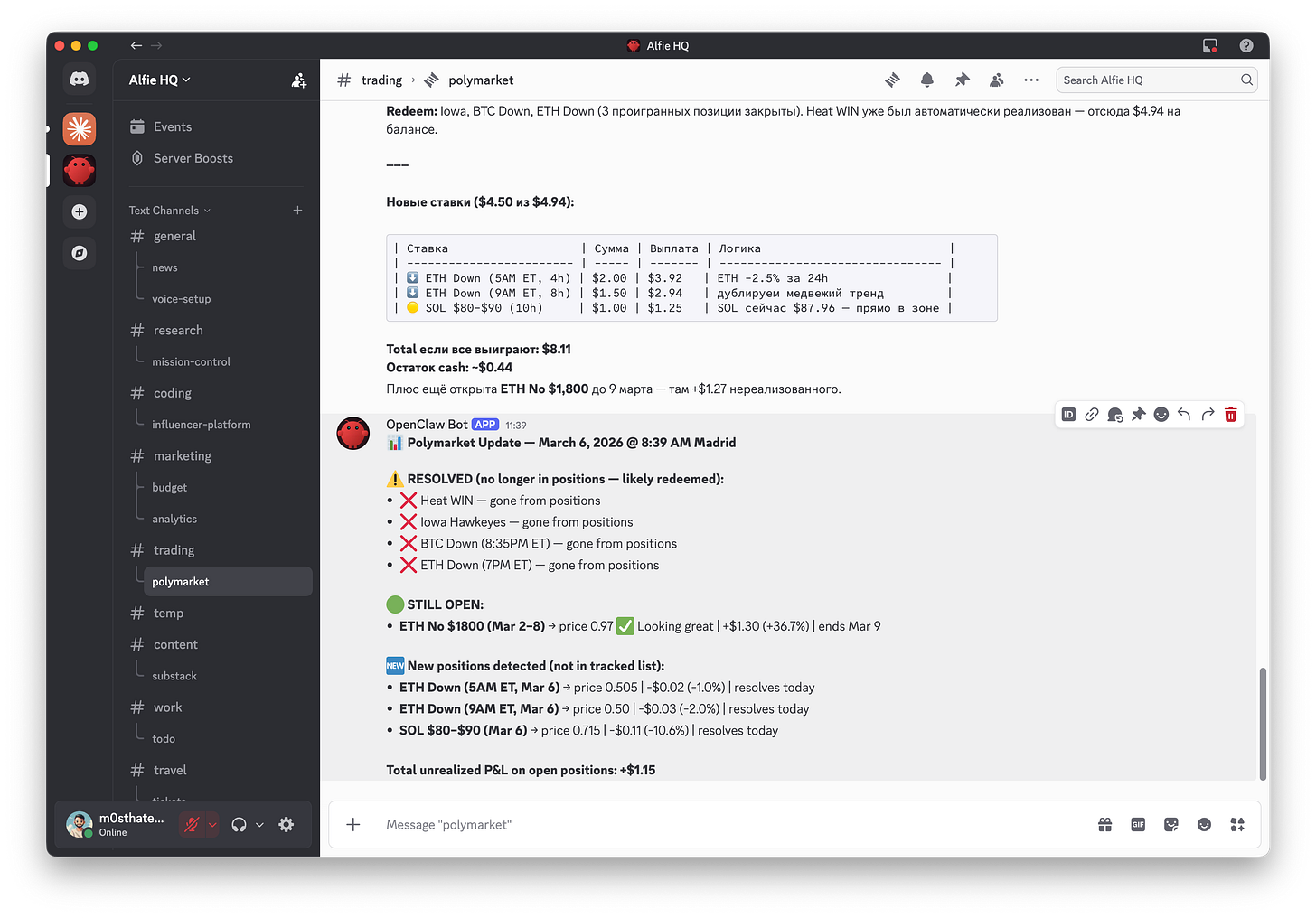 The way it actually works day-to-day: I have a Discord server with channels for different areas of work — content, trading research, projects, ops. Each channel is its own persistent session. When I open #substack, the agent knows we’ve been discussing blog topics. When I switch to #trading, it knows about positions and market research. Context doesn’t bleed between channels, and nothing resets. This morning it suggested this post topic on its own, based on what we built yesterday. I didn’t ask. That’s the whole point.