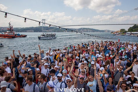 Three thousand people passed through. Eight hundred active at peak. We became the largest team at the Bosphorus Cross-Continental Swim. I crossed it four times. We were the biggest crew in Oceanman worldwide. Largest team at Vienna, Munich, and Cyprus marathons. 180 out of 400 Ukrainian slots were ours on Bosphorus. From the whole country. Registration closed in 7 minutes.